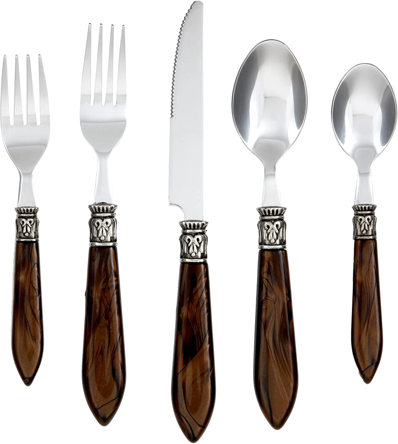 - 20-Piece set includes: 4 each; Salad Fork, Dinner Fork, Dinner Knife, Soup Spoon and Teaspoon