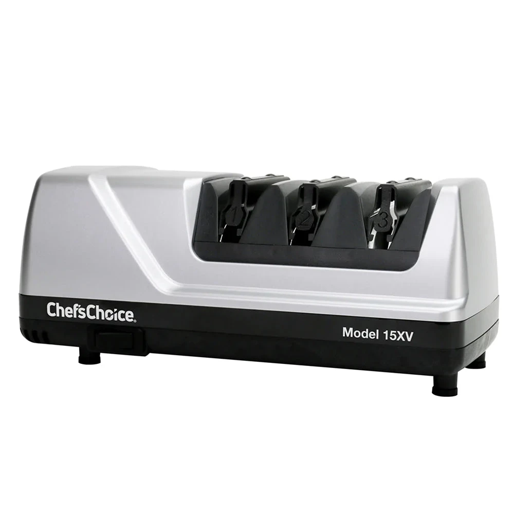The 15XV professional 3-stage electric knife sharpener is the ideal solution for improved cutting performance on 15-degree class knives. Using 100 percent diamonds, the hardest natural substance on earth, our patented abrasives sharpen faster and easier to create an ultra-sharp, longer-lasting edge. In the final stage, patented stropping disks create an unparalleled polished finish. Precision angle guides ensure accurate sharpening throughout the entire blade length and eliminate any guesswork. In addition, this sharpener can easily convert a traditional 20-degree knife edge to a more precise 15-degree edge. This unit is designed to work with both straight-edge and serrated knives. Covered by the Chef’sChoice Three-Year Limited Warranty.
