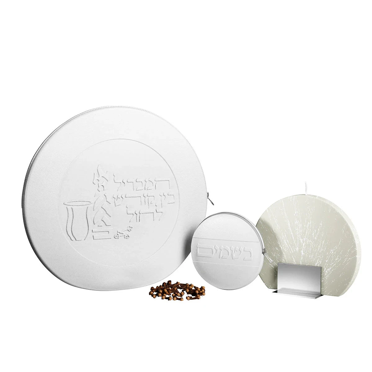 A strikingly beautiful Classic Havdalah Leather Pouch Set that has it all. Embossed with a gorgeous havdalah scene. A sophisticated complementary Havdalah candle, paired with a smaller leather pouch for besamim. Practical and gorgeous – the perfect combination!