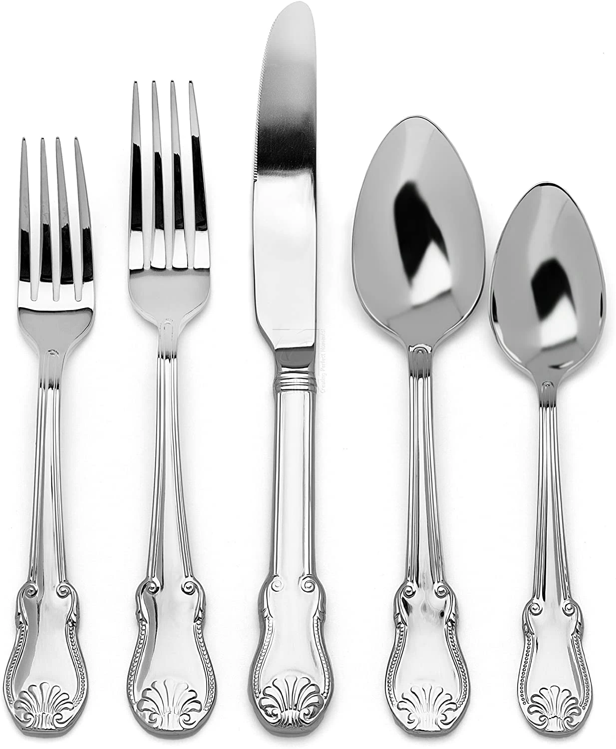 - Set contains 4 each of dinner knife, tablespoon, tea spoon, dinner fork, and salad / dessert fork
