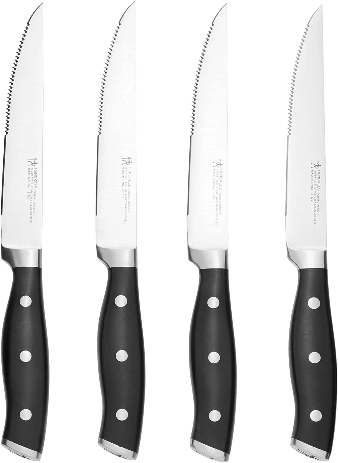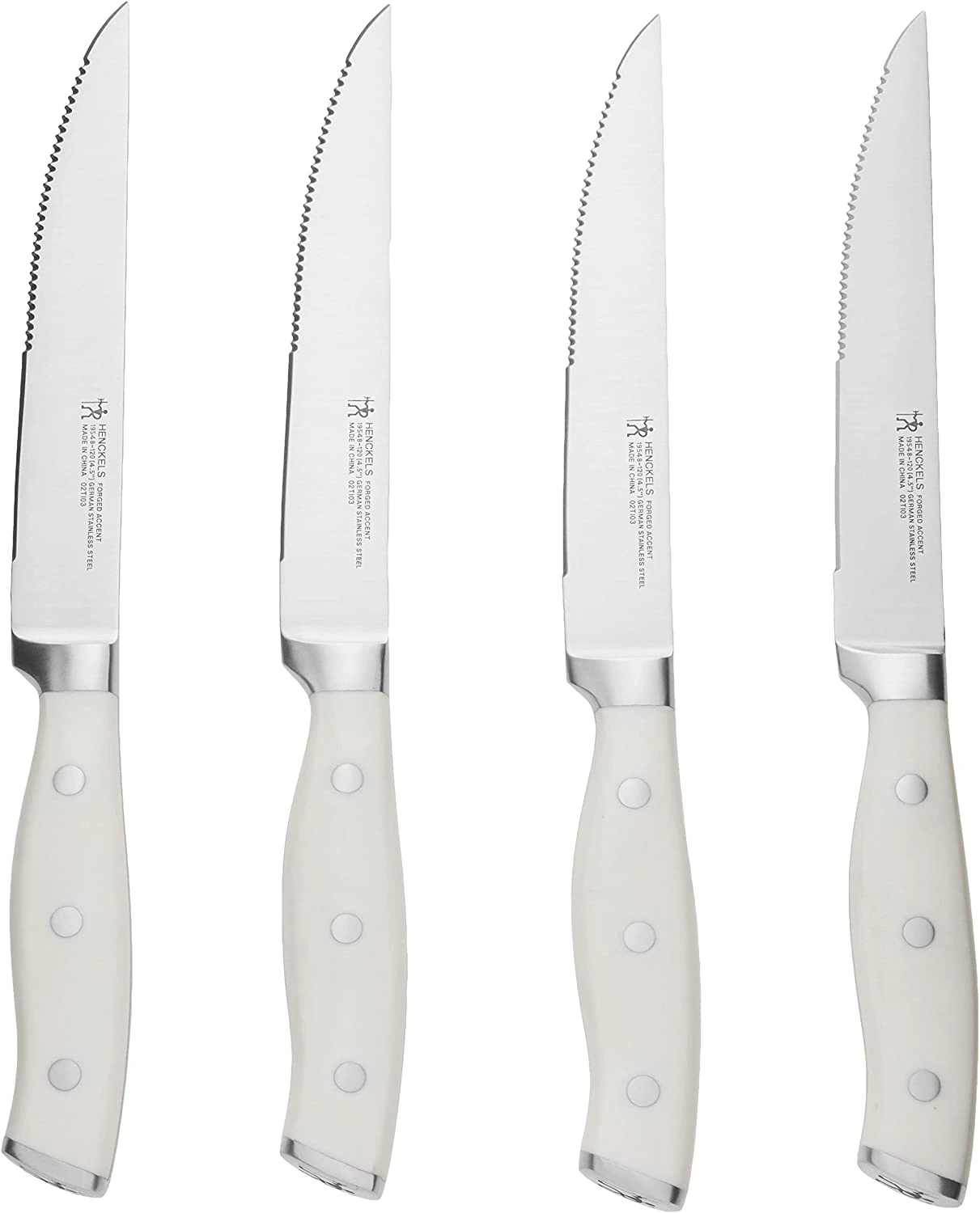 The Forged Accent steak knife set includes 4 knives with semi-serrated edges, so that you can slice through meat and poultry with razor sharp precision. These knives feature a handsome white handle and are stored in an attractive black gift box.