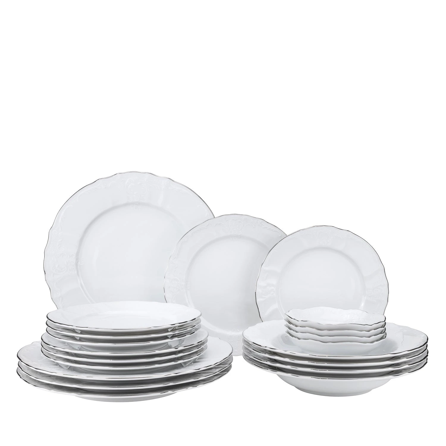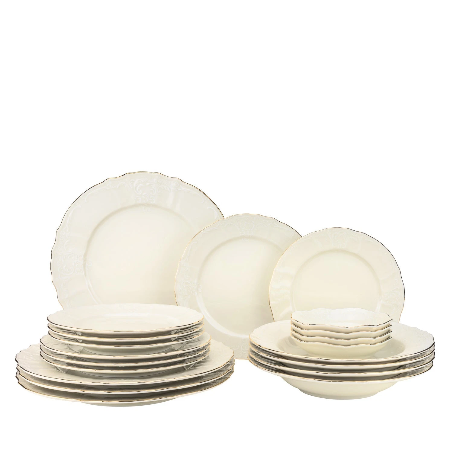- Four 10.5″ Dinner Plates, Four 9″ Flat Plates, Four 8″ Salad Plates, Four 8.5″ Soup Plates, and Four 5.5″ Compotes