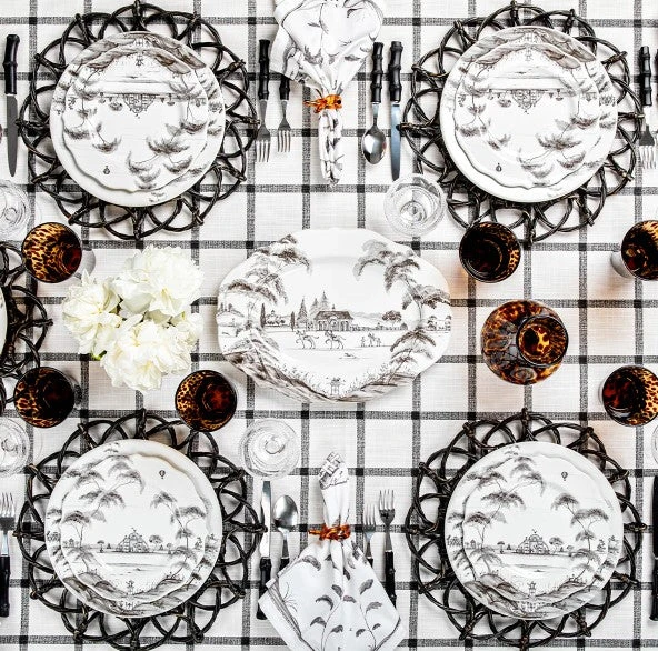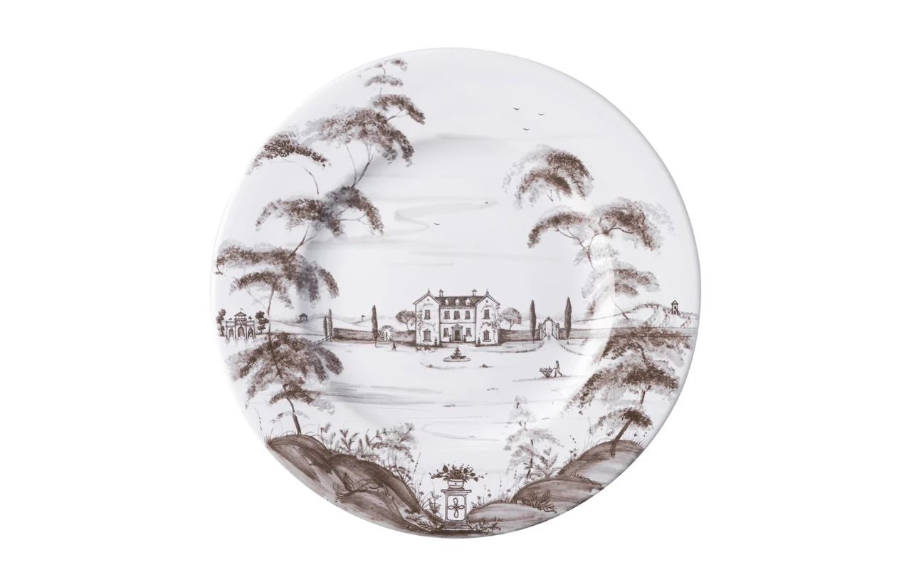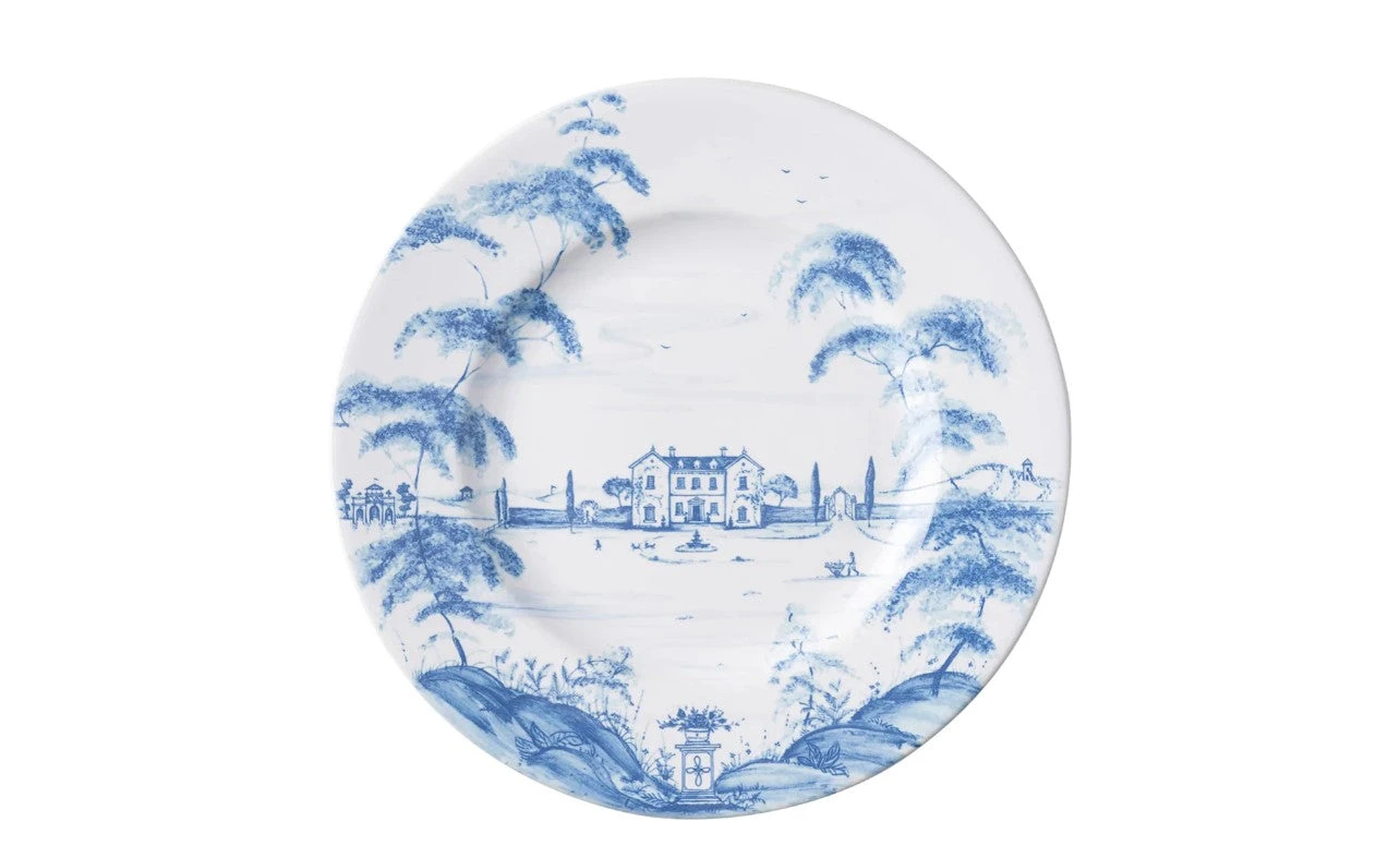 From the Country Estate Collection- Welcome to the main house, where friends and family have gathered for generations and country food is raised to a point of fine art. A feast for the eyes and table, our stately dinner plate is a portrait of the inviting and bustling life you can explore on the estate and where you can always find something delectable bubbling away in the kitchen. Featuring: the Main House, Boathouse, and Apple Orchard. Choose from delft blue or flint grey.