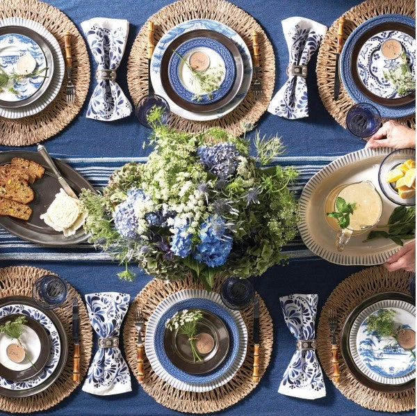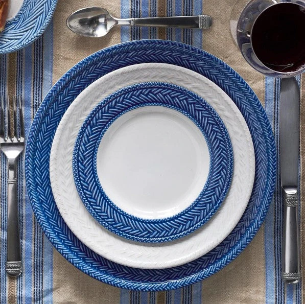 From the Le Panier Collection- Inspired by the French basket weave often found in equestrian and nautical traditions, the border is beautifully hand-painted; choose from whitewash/ivory, a windswept delft blue, or grey mist.