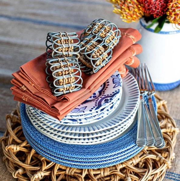 From the Le Panier Collection – Inspired by the French basket weave often found in equestrian and nautical traditions; the textured woven border is beautifully hand-painted, choose from Whitewash/ivory, Grey Mist – a neutral grey wash, or Delft Blue