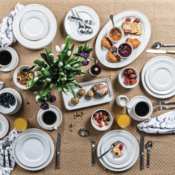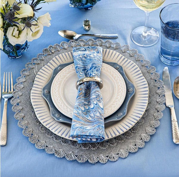 From the Le Panier Collection- Inspired by the French basket weave often found in equestrian and nautical traditions, the border is beautifully hand-painted; choose from whitewash/ivory, a windswept delft blue, or grey mist.