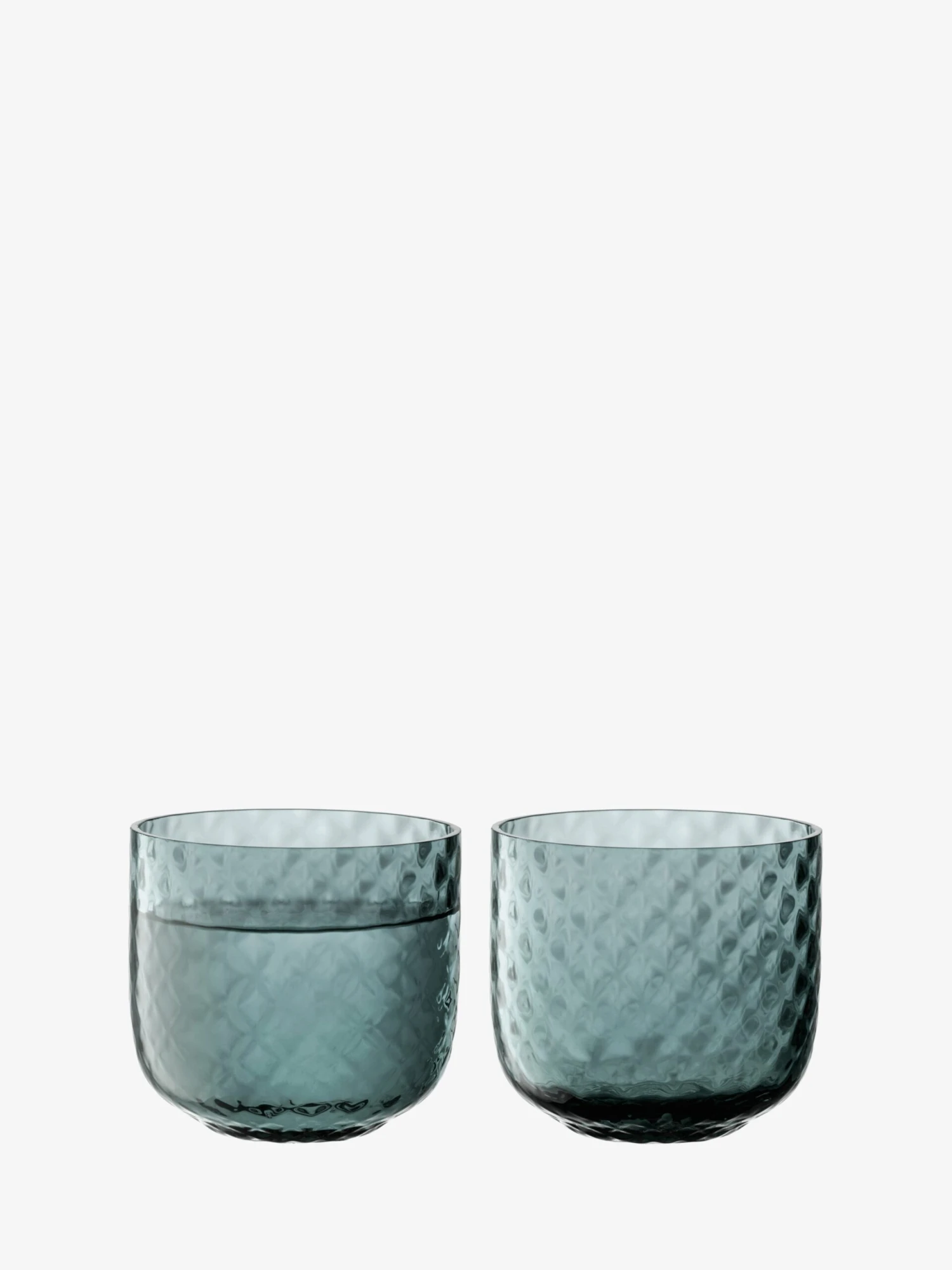A pair of mouth-blown tumblers with fine rims and walls. Versatile in shape with an all-over textured finish. Designed for water and cocktails or for using as a stemless wine glass.