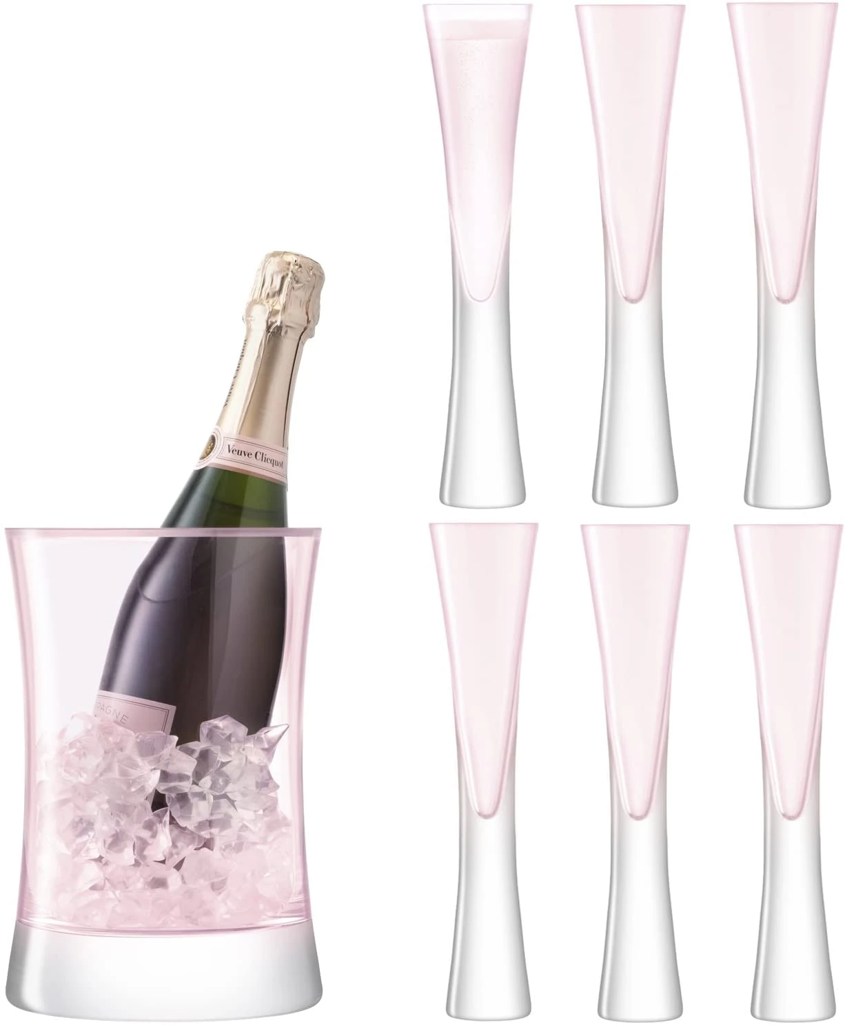 A mouth-blown glass champagne serving set. Each flute’s fine bowl and thick, flared stem is mouth blown as one piece of glass. The ice bucket has a complementary curved design. The subtle pink tint is inspired by the colour of rose champagne.