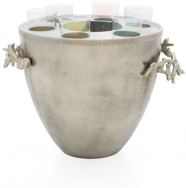 - Micheal Aram, Ocean Reef Vodka Service (w/ 6 Shot Glasses) 11″W x 8″H, Bucket 8″ Dia. ; Hand Textured Stainless Steel, Nickelplate, Grey Sand Washed Enamel, Crystal