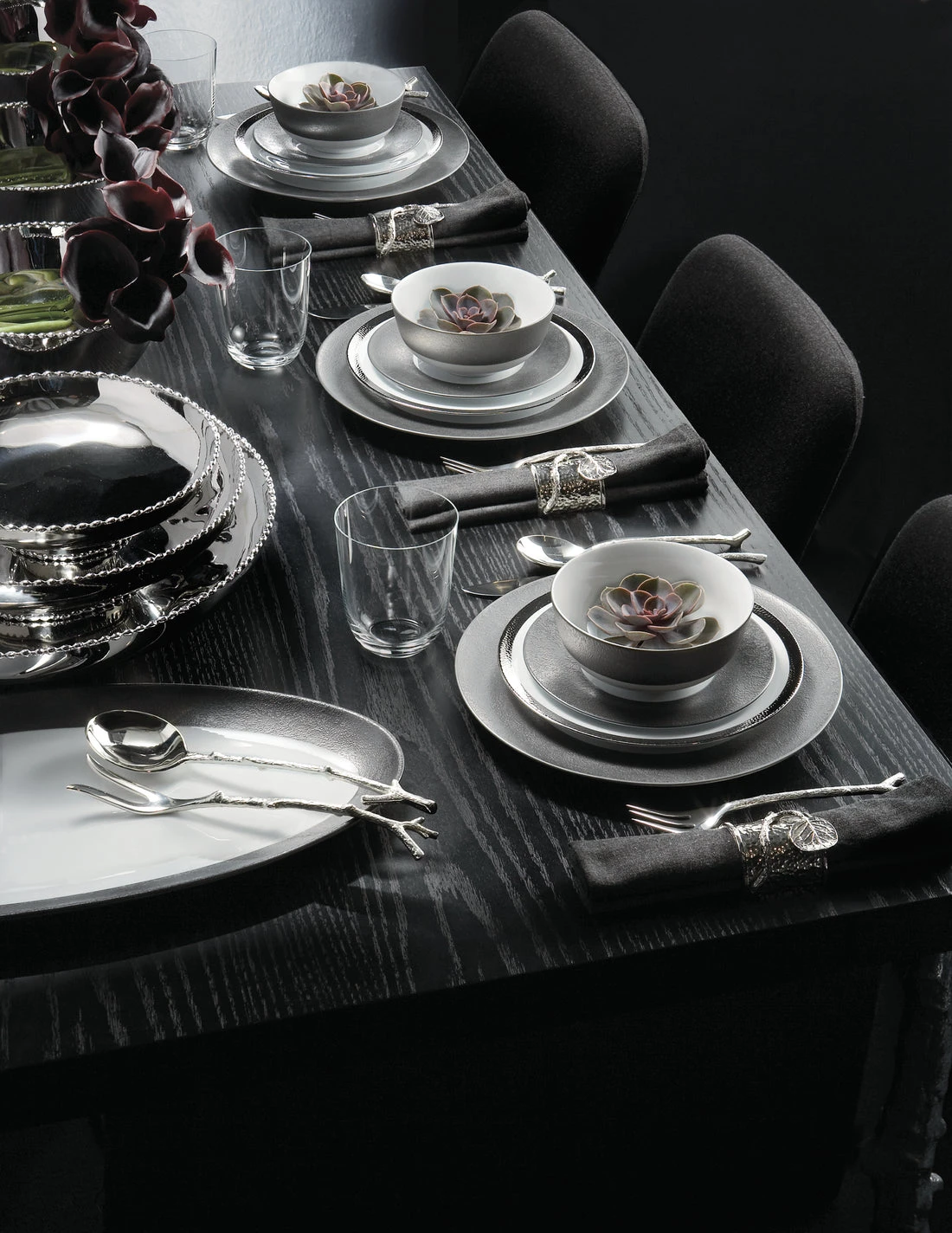 The Michael Aram Silversmith Collection is a homage to the simple beauty of the forger’s craft. The texture of hammertone has been seen for millennia in metal objects, bearing silent testament to each stroke of the hammer. The surface that remains is faceted and meticulous without losing its random and organic feeling. The Silversmith Collection of fine porcelain strives to capture this mystical and timeless motif. The design is also carefully crafted in terms of color and detail to integrate perfectly with any of Michael’s other dinnerware patterns. The unified body shapes used in all of the motifs make mixing and matching the patterns a seamless proposition.