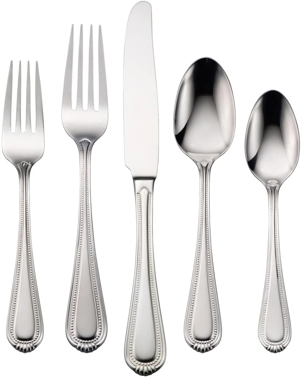 - 45-piece flatware set with service for 8. Set includes 8 each: salad fork, dinner fork, dinner knife, dinner spoon and teaspoon. Also includes: serving spoon, pierced serving spoon, meat fork, butter knife and sugar spoon
