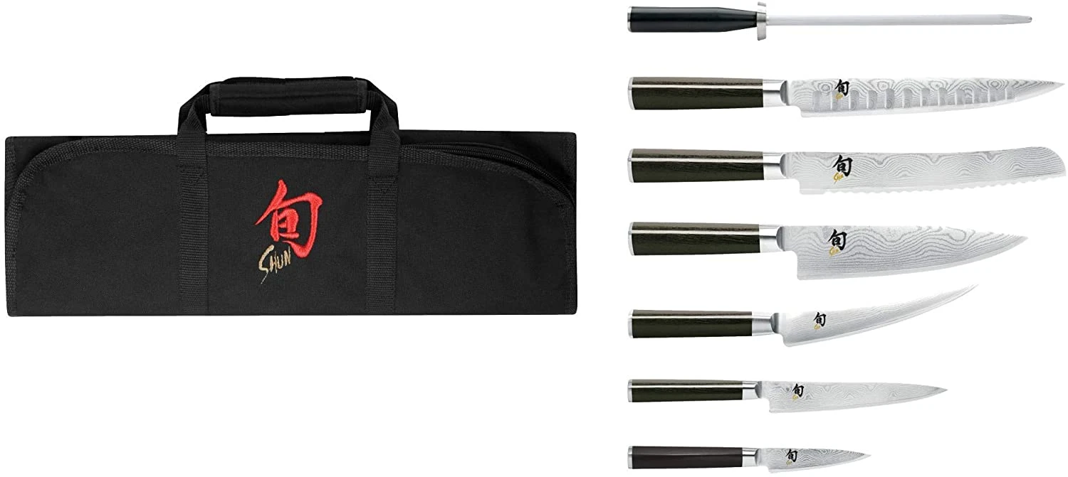 - Includes: Shun Classic 8-inch Chef’s Knife, 3.5-inch Paring Knife, 6-inch Utility Knife, Boning/Fillet Knife, 9-inch Bread Knife, Hollow-Ground Slicing Knife, Shun Honing Steel and Nylon Knife Roll