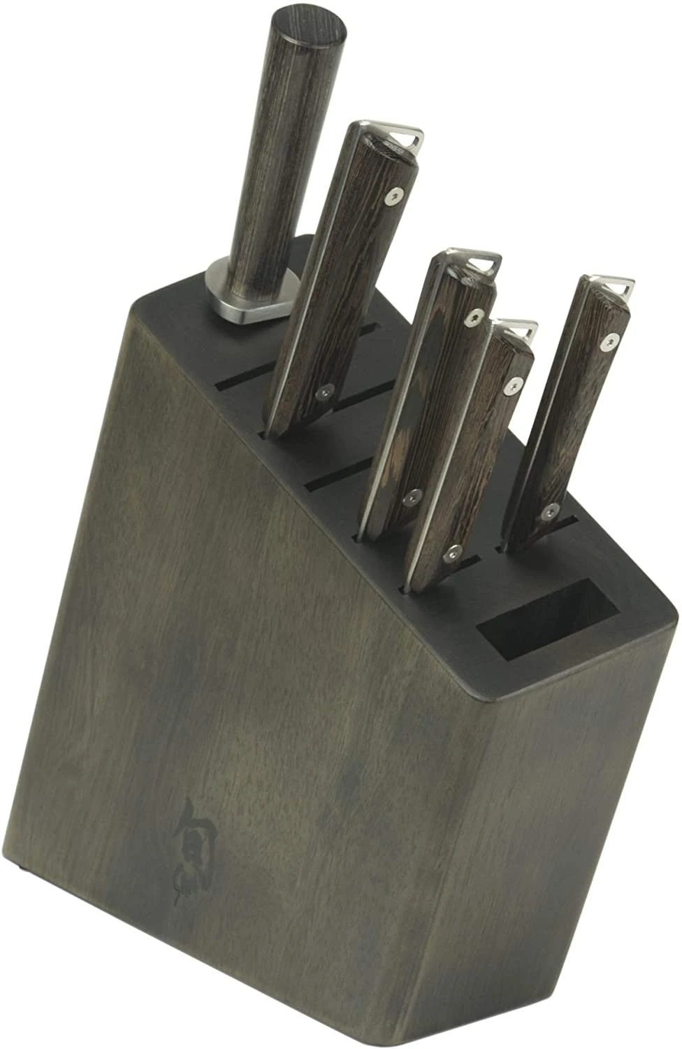 - The Shun Angled Block provides a convenient home for the knives and honing steel with two additional slots for an expanding cutlery collection and a space ideal for kitchen shears
