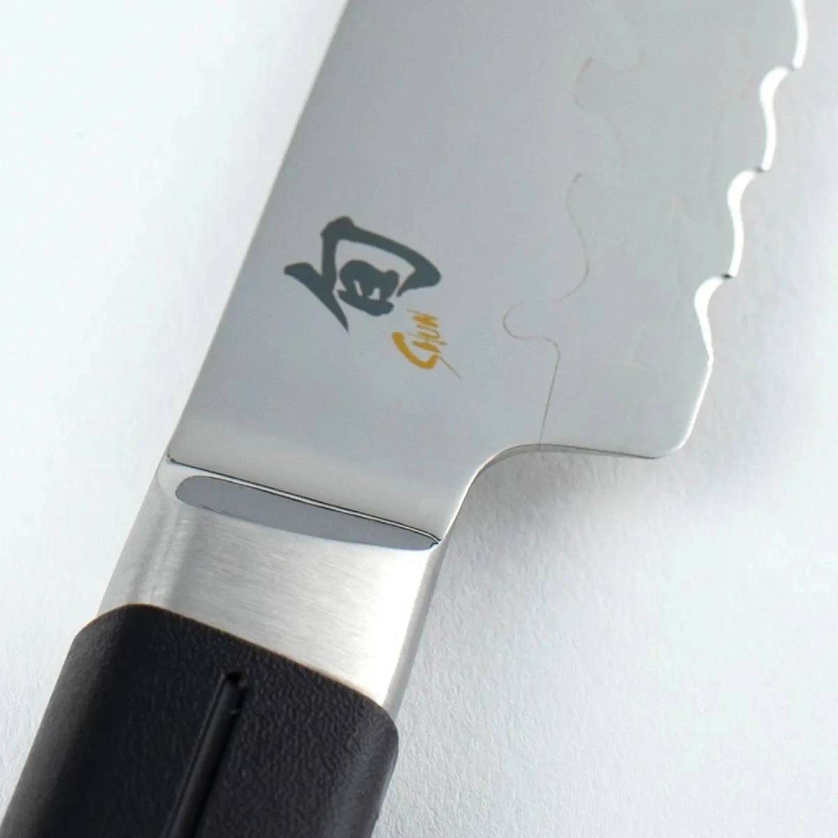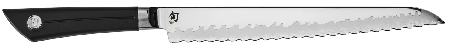 What makes this bread knife special—and better—is the way Shun has crafted the serrations. These are not jagged little teeth that chew through your bread. These are razor-sharp, wide serrations. These wider serrations glide through the bread with ease. Cutting is even smoother because Shun designed the serrations so there’s an equal amount of cutting power on the forward and back strokes. Look at the blade and you can see that the serrations lean forward on the front of the blade and backward on the back of the blade. That small change makes a big difference in cutting ease.