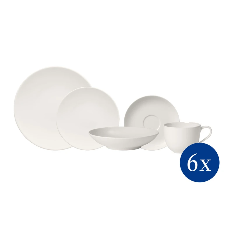 This modern white For Me Dinnerware set is service for six, it features clean lines and a minimalist design that will make it a versatile staple in your home for many years to come. Premium porcelain. Dishwasher safe. Microwave safe. Gift Boxed. Made in Germany.