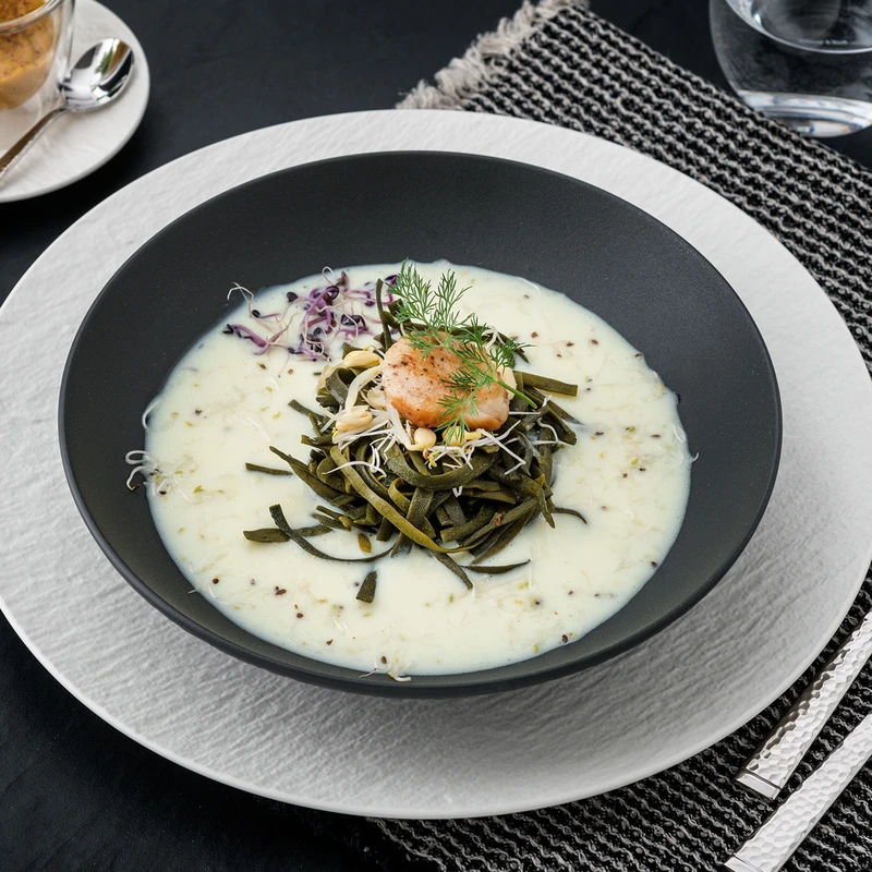 Natural, original and with a special feel: this is Manufacture Rock. The artisanal style in the form of matte slate-looking porcelain makes the collection truly unique. Mix and Match the Black and White pieces from the Manufacture collection to make your table uniquely your own. This stylish deep bowl is perfect for pasta, vegetables, potatoes and salads. The raised rim is very practical for drip-free serving. Impress your guests with sophisticated tableware design. Premium Porcelain. Dishwasher Safe. Microwave Safe. 11.5″ x 11.5″ x 2.25″ Holds approx 14.25 oz Made in Germany.