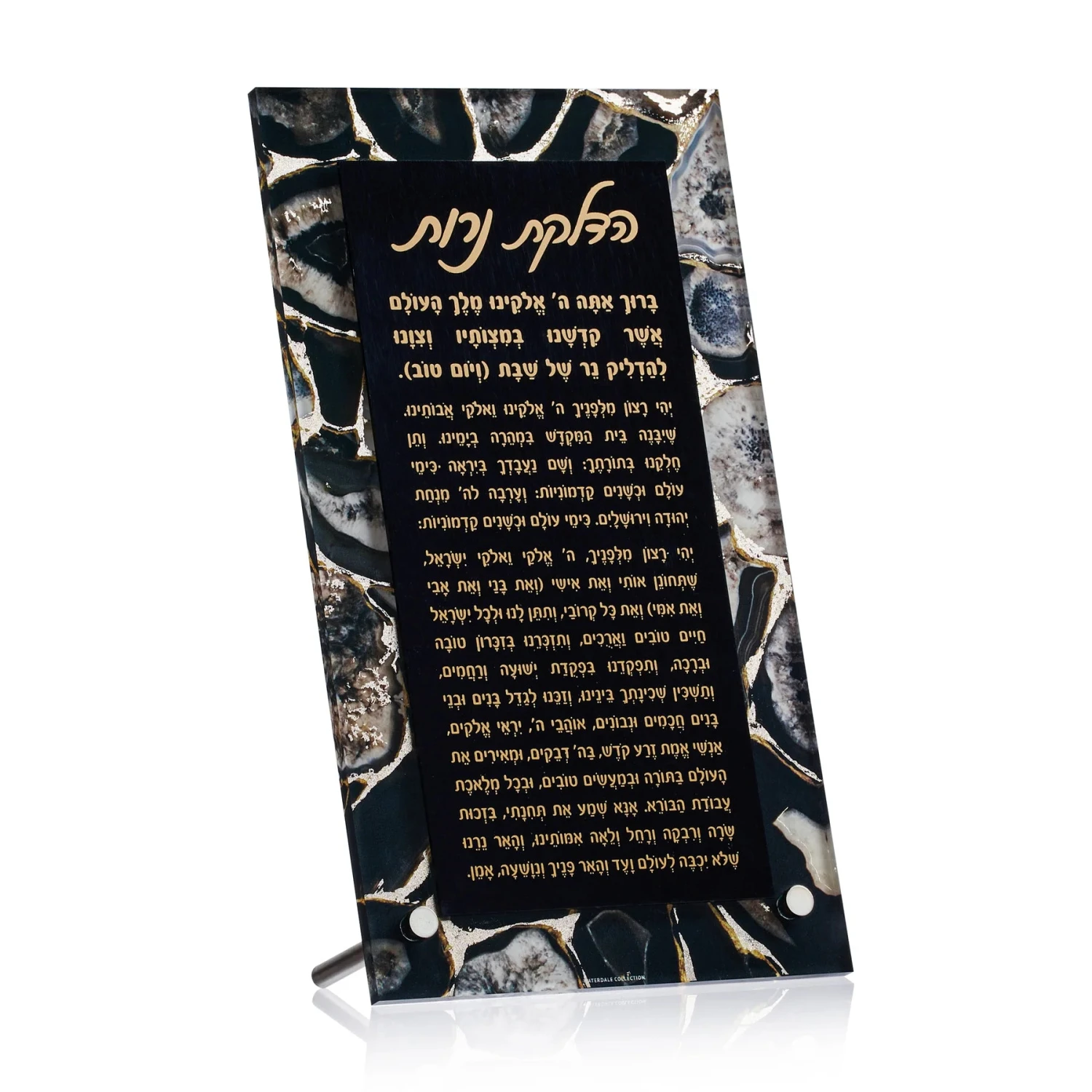 This beautiful exquisite Agate Tabletop Hadlokas Neiros features a natural stone print on thick lucite, metallic embellishments, and another layer of lucite on top with an easy to read print. Freestanding, so sleek, and the perfect and practical addition to your candle lighting! Coordinate with the agate collection.