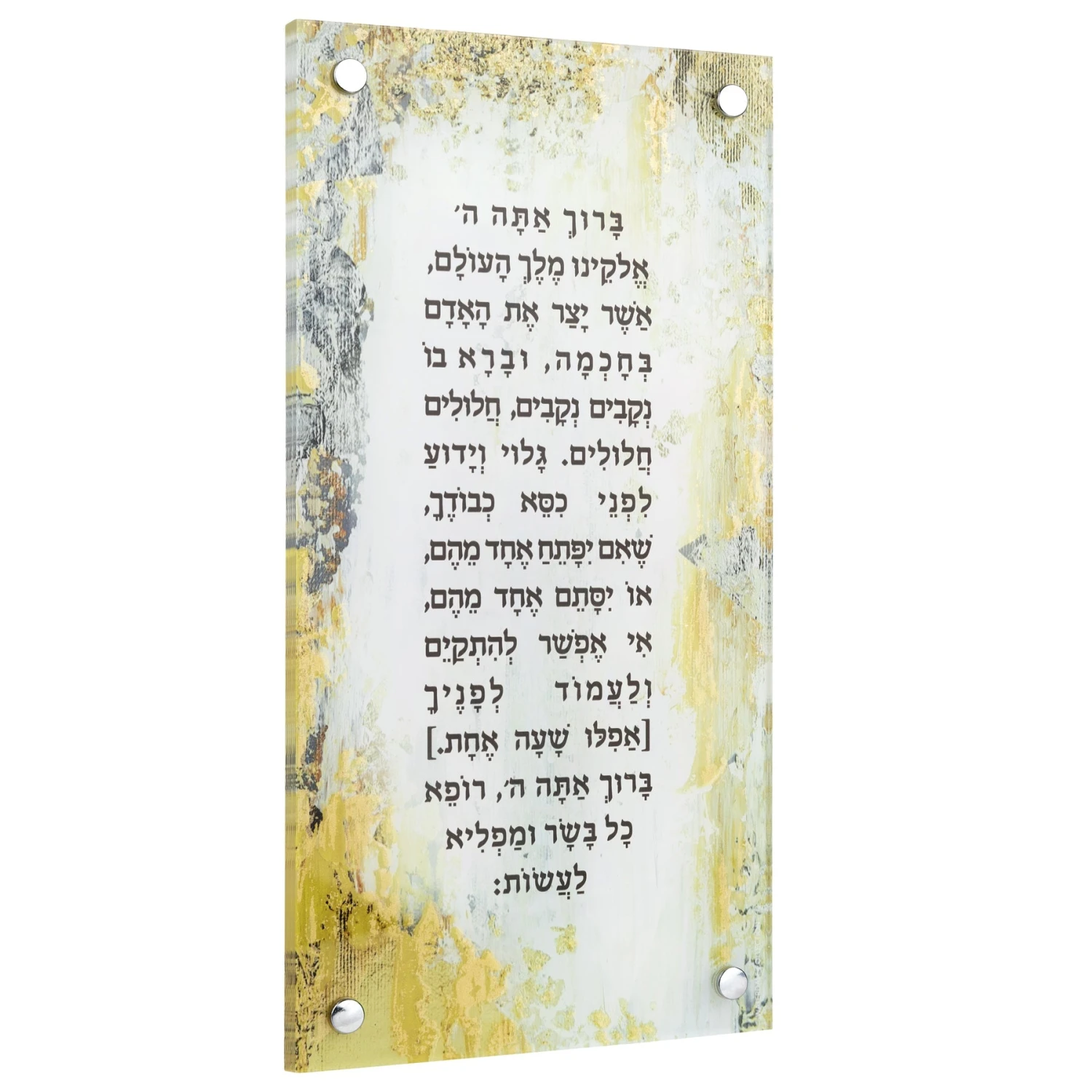This beautiful exquisite Painted Lucite Asher Yatzar is printed on crystal clear lucite with metallic gold addition for an almost fully original feel. Coordinate this masterpiece with others in the same collection.