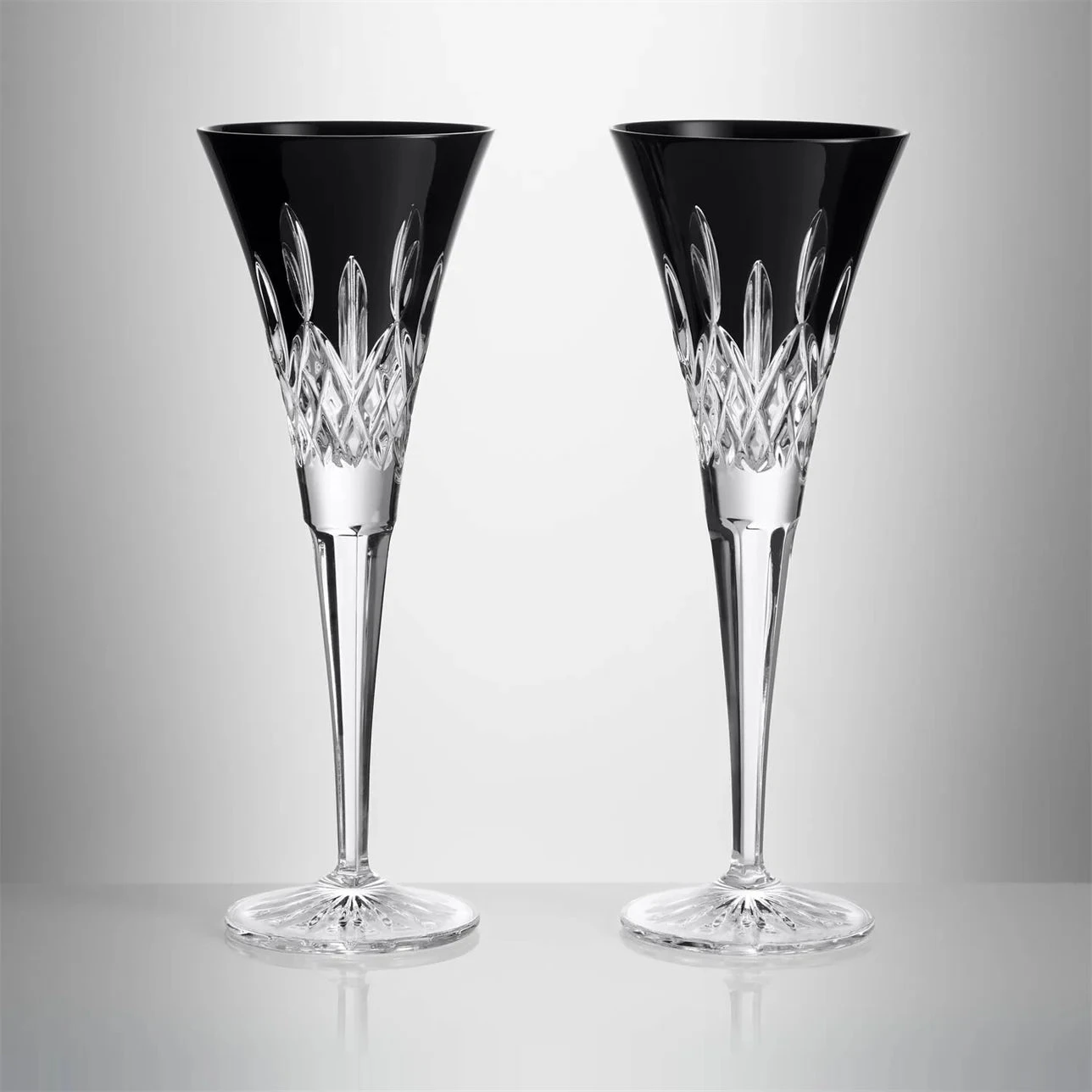 Our best-selling Lismore pattern takes a dramatic turn with the Lismore Black collection. Rich opaque black color adds a striking contrast to the sparkling clear crystal, emphasizing the deep cuts of the beloved Lismore pattern. Raise a toast with a champagne cocktail or sparkling beverage in this daring and stylish Lismore Black Flute Set of two.