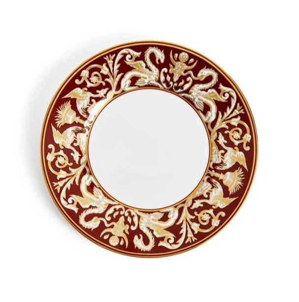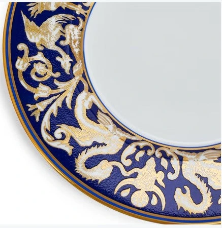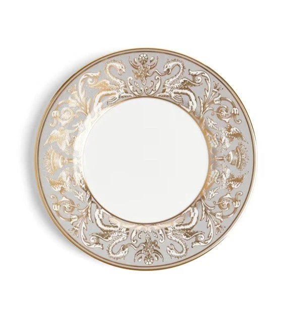 Add some dazzling impact to your dining table with this Renaissance Gold Florentine Accent Plate. Golden mythical creatures stalk the cobalt blue border, ready to bring your table setting to life. Made from silky white fine bone china, this plate is inspired by over 260 years of expressive patterns in our archives. Use the Florentine accents to add a dramatic focal point to your Renaissance Gold table setting or mix and match with other Wedgwood collections to create a setting that is uniquely your own. Choose from three variations: deep blue, grey, or a rich red.