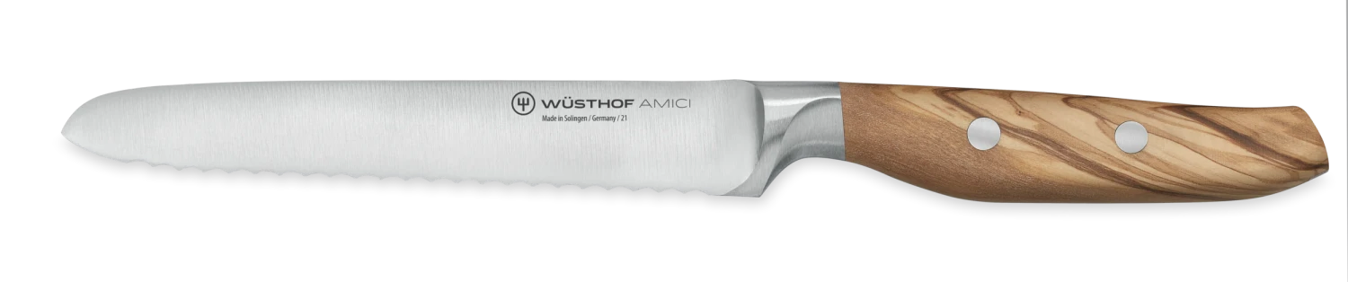 The serrated blade slices cleanly and elegantly without crushing or tearing, and a full bolster offers added protection for your fingers. The custom-grained Calabrian olive wood handle is naturally water-resistant and antibacterial, and its organic shape fits comfortably in hands of any size.
