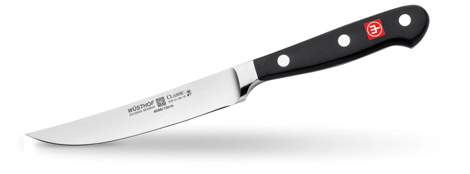 WÜSTHOF’S best-selling collection for generations, CLASSIC full-tang knives are precision-forged from a single piece of an exclusive high-carbon stainless steel. CLASSIC knives feature a new handle design made of a highly durable synthetic material – Polyoxymethylene (POM) – which has a tighter molecular structure to resist fading and discoloration. The CLASSIC 4 1/2″ Steak Knife is the perfect sharp table knife used to cut through steak, filets and other thick meats. WÜSTHOF Steak Knives have a straight clean edge that glide through beef like butter without shredding or damaging the meat.