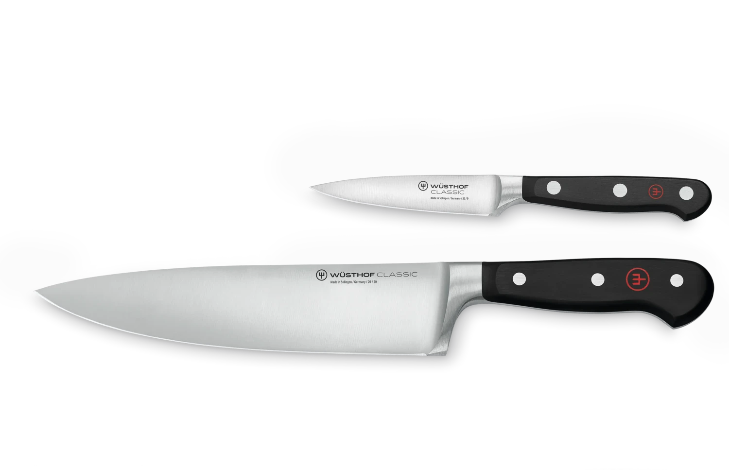 WÜSTHOF’S best-selling collection for generations, CLASSIC full-tang knives are precision-forged from a single piece of an exclusive high-carbon stainless steel. CLASSIC knives feature a new handle design made of a highly durable synthetic material – Polyoxymethylene (POM) – which has a tighter molecular structure to resist fading and discoloration. The Two Piece Starter Set includes a 3 1/2″ Paring Knife and 8″ Cook’s Knife.