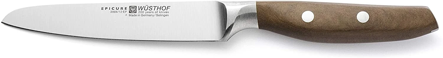 Designed by Björn Berger, a successful industrial designer born in Solingen, Germany – the world headquarters of WÜSTHOF since 1814 – EPICURE is a finely edited collection of precision-forged, full tang cutlery. EPICURE knives sport a new blade shape with dynamic, modern lines, and an inviting handle design using the same mid-tone, wood composite material found in today’s popular, high-end Epicurean® cutting boards. Ergonomically crafted for optimum comfort, the handles are purposefully sculpted to reduce fatigue, as well as look beautiful in the kitchen. In homage to the signature feature of many WÜSTHOF cutlery collections, the handle of each EPICURE knife is sturdily fastened with two stainless steel rivets. The EPICURE 4 1/2″ Utility Knife is smaller than a cook’s knife but larger than a paring knife, making it the perfect knife for magnitude of tasks. A utility knife is much like a versatile paring knife and is perfect for mincing shallots, onions and herbs as well as cutting vegetables or cutting small meats.