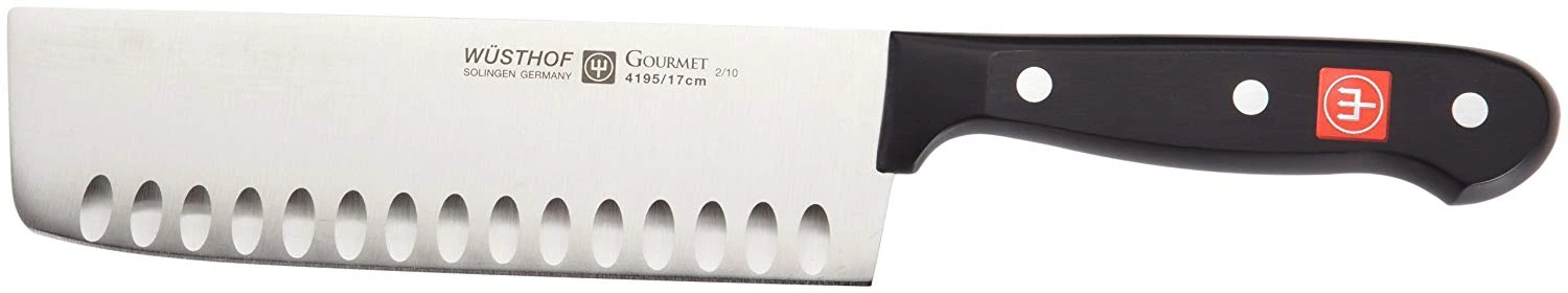 GOURMET laser-cut knives are crafted in the company’s factory in Germany. Well-balanced and durable, GOURMET knives are made of high-carbon stainless steel. GOURMET knives feature a new handle design made of a highly durable synthetic material – Polyoxymethylene (POM) – which has a tighter molecular structure to resist fading and discoloration. The GOURMET 7″ Hollow Edge Nakiri Knife is designed with a thinner blade than the traditional cleaver, at a 10° cutting edge, and features a long straight edge. The hollow edge is crafted with evenly spaced vertical indentations, which create small air pockets between the blade and the food. These small air pockets gently push food off the blade and reduce friction and drag. This knife allows cooks to effortlessly prep a wide array of fresh produce, including starchy vegetables like potatoes, which tend to stick to a knife’s blade.
