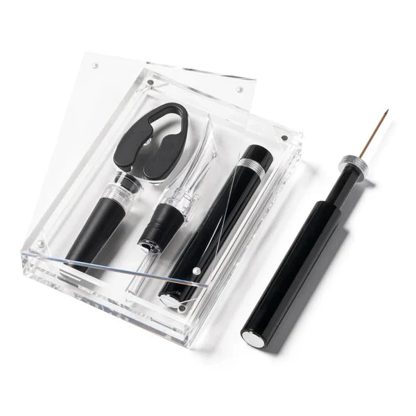 Cased in a thick lucite case with a magnetic top, these quality accessories will enable easy opening and storing of wines.